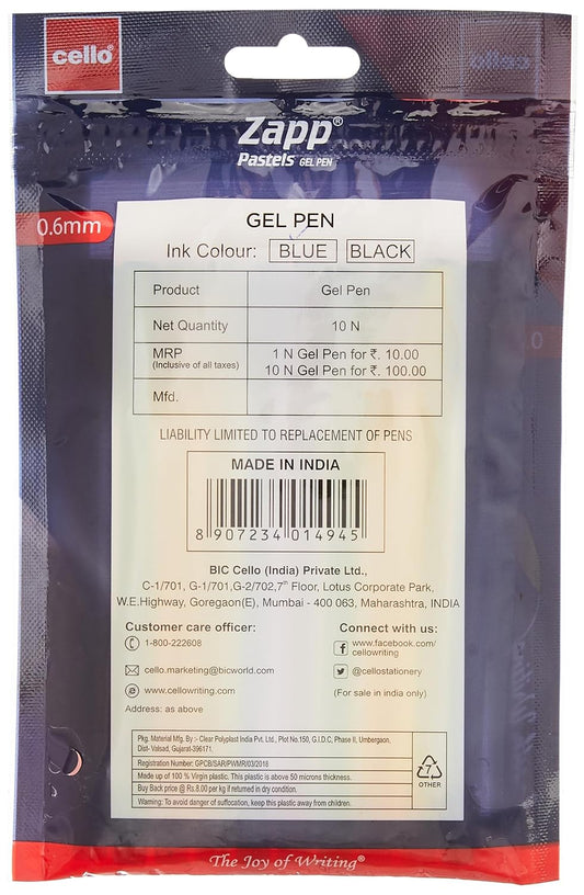 Cello Zapp Pastels Gel Pens| 10 Blue Gel pens| Gel Pens Set for Students | Gel Pens for School Use| Gel Pens for Writing Pens