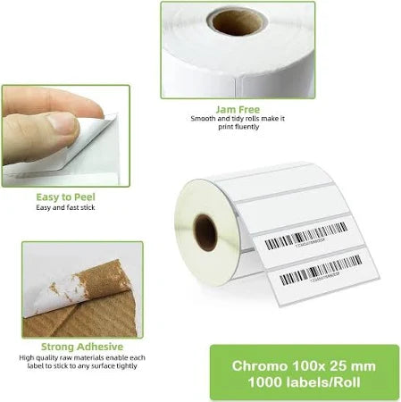These 100x25 mm direct thermal self-adhesive labels are designed for reliable performance during transit. Featuring durable inks, they ensure clear and lasting readability, making them ideal for shipping, inventory, and tracking applications where label integrity is critical.