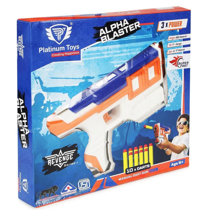 The Alpha Blaster is a manual dart gun featuring 10 Revenge series-1 darts constructed from heavy-duty ABS plastic and TP materials for long-lasting durability. Enjoy hours of fun with this classic dart blaster!