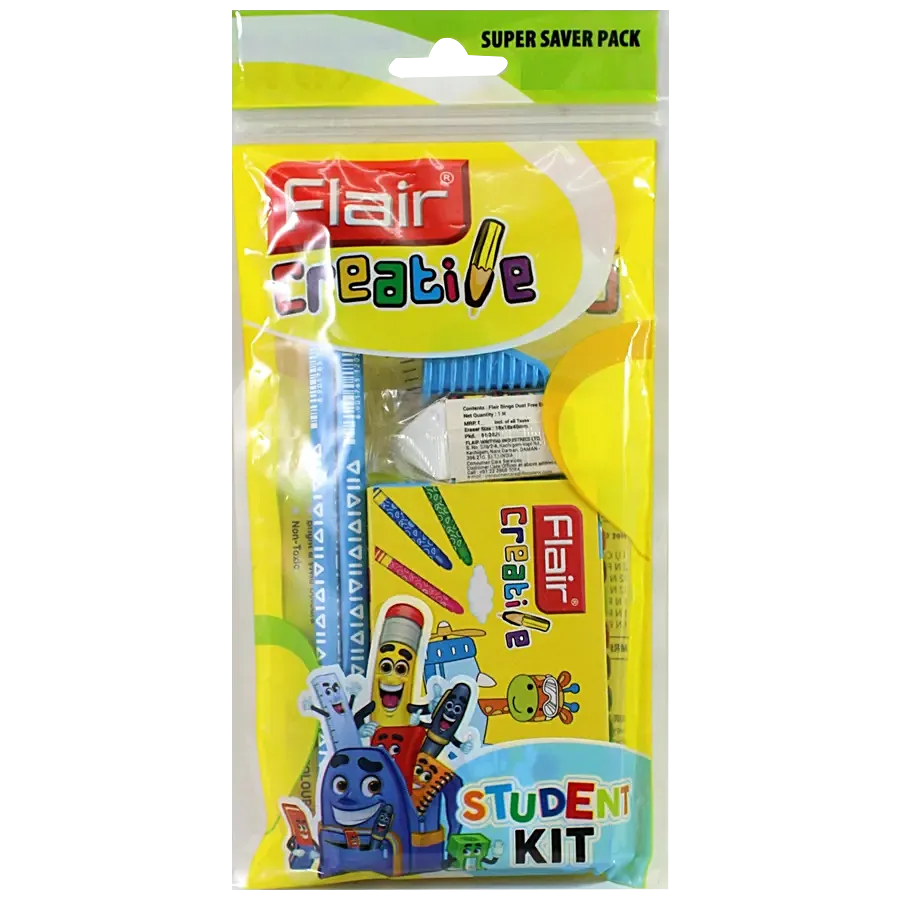 Flair Creative Super Kit is a commitment to quality and innovation are Flair's pillar stones. These competencies have led Flair to become one of the top manufacturers of a complete range of writing instruments from India. All the essentials in one. The Flair Creative Super Kit is exactly what the name suggests - Super. This kit is all you need to get through a regular school day - a pen, pencils, sketch pens, crayons, eraser, scale and sharpener. No more is there a need to buy individual items for your school box.