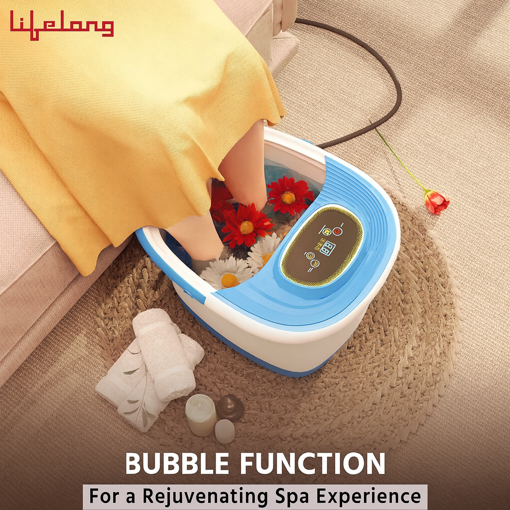 Lifelong LLM801 500W Electric Foot Massager Spa Machine With 8 Manual Rollers, Digital Panel, Bubble Bath & Water Heating Technology For Pedicure, Pain Relief & Foot Care, Blue