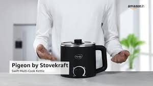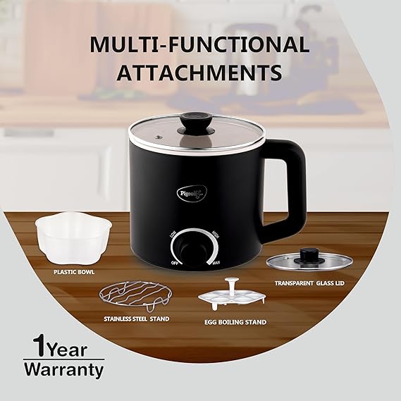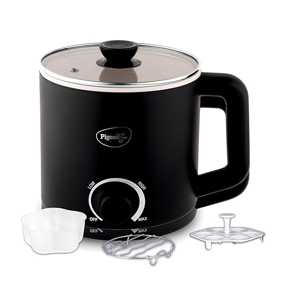 Pigeon by Stovekraft Swift Multi-Cook Kettle 1.5L, Egg Rack - Black | Double Layered | Food Grade Stainless Steel Inner wall | Glass Lid | Auto Shut