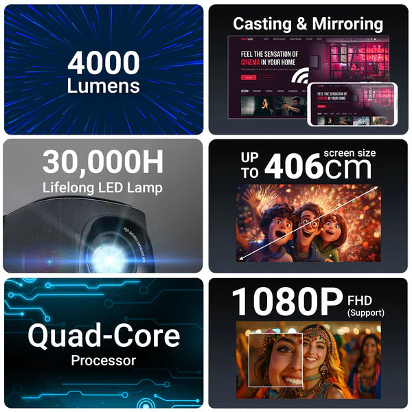 ZEBRONICS PIXAPLAY 24, Smart LED Vertical Projector, 4000 Lumens, 1080p Support, 160" Screen Size, Auto Focus